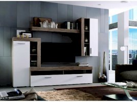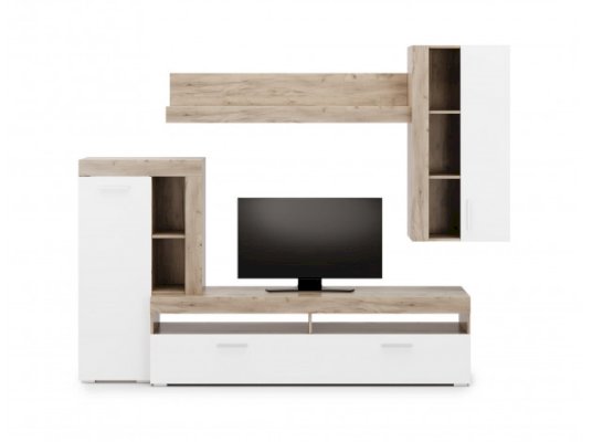 Преимущества: вместительная — множество открытых и закрытых полок для мультимедиа аппаратуры, книг, сувениров и предметов декора; стильная — минималистичный дизайн гармонирует с оригинальным цветовым исполнением; функциональное наполнение — включает ТВ-тумбу, большую навесную полку и два небольших, но функциональных шкафа.