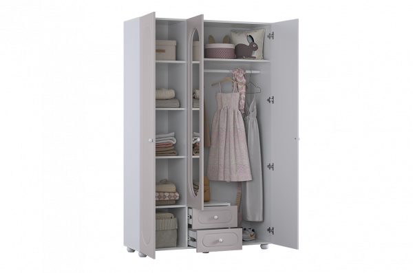 Шкаф оснащён тремя распашными дверями: две крайние двери выполнены из МДФ, а средняя дверь дополнена зеркалом, которое визуально расширяет пространство и делает комнату светлее. В нижней части предусмотрены два выкатных ящика, подходящих для хранения белья, аксессуаров или повседневных вещей.
