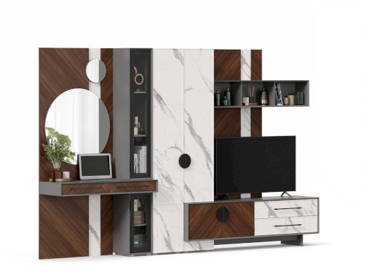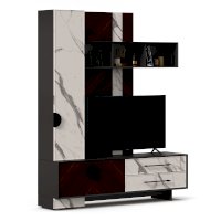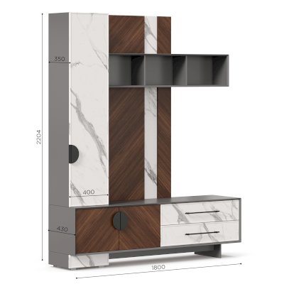 • Модуль скомбинирован из наборной панели, шкафа одностворчатого, тумбы для ТВ и открытых полок