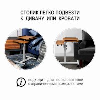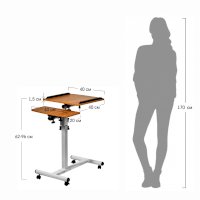 Столик оборудован поворотной столешницей из МДФ, состоящей из двух  независимых частей,  и металлическим основанием. Угол поворота столешницы составляет 180°, вплоть до вертикального положения. Высота подъема регулируется в диапазоне от 62 до 96 см. На столешнице имеются ограничители для ноутбука, планшета, предотвращающие падение гаджета.