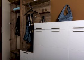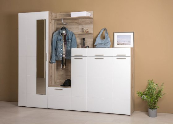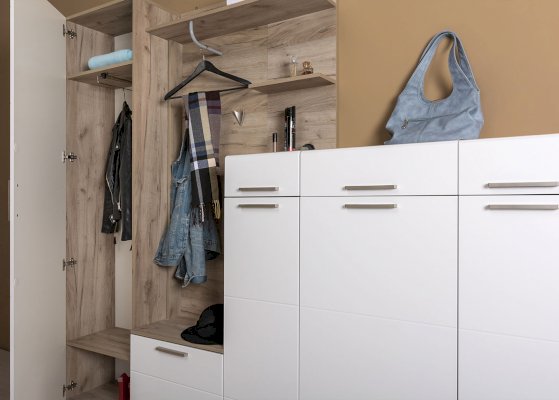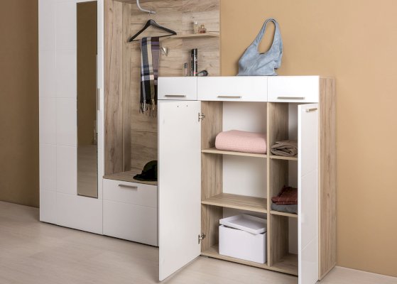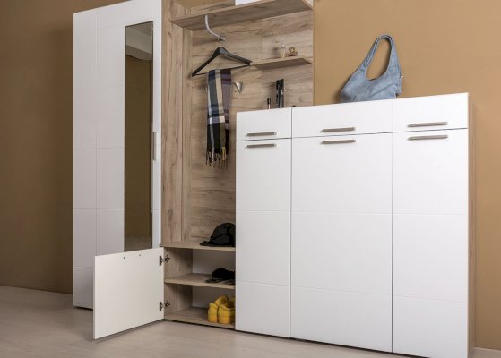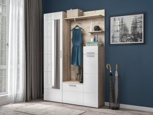Универсальный модуль этой прихожей может быть дополнен шкафом для одежды.